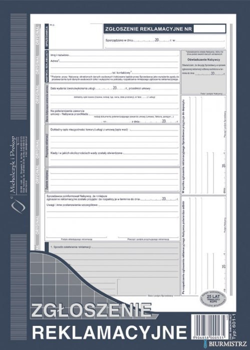 601-1 Zgłoszenie reklamacji MICHALCZYK&PROKOP A4 40 kartek