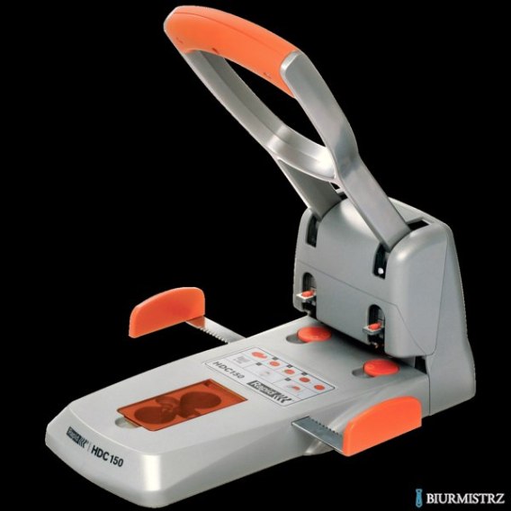 Dziurkacz HDC 150/2 Rapid_- mocny dziurkacz z serii narzędzi profesjonalnych do zastosowania w firmach, w których dziurkuje się duże pliki - jednorazowo do 150 kartek_- dzięki precyzyjnym ostrzom wykonanym ze stali najwyższej jakości można wykonać tę czynność bez wysiłku_- posiada mechanizm ułatwiający ułożenie dokumentów w pozycji zapewniającej właściwy układ dziurek, ergonomiczną rączkę wykonaną z miękkiego tworzywa, przezroczyste pojemniki na konfetti oraz części zapasowe_- dostępny również w wersji na 4 otwory_- zapasowe elementy typu ostrza i dyski należy wymienić po zużyciu oryginalnie dołączonych do urządzenia_- jednostka sprzedaży 1 sztuka