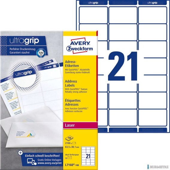 Technologia druku:•LASER: Tak•LASER COLOR: TakCechy produktu:•Rozmiar etykiety (mm): 63,5 x 38,1•Etykiet / arkusz: 21•Arkuszy/ opakowanie: 100•Etykiet/ opakowanie: 2100•Kolor: białe•Format: A4•Rzędów/ arkusz: 3x7•Certyfikaty: FSC
