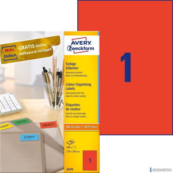 Etykiety czerwone 3470 210 x 297 100 ark. trwałe, Avery Zweckform SALE