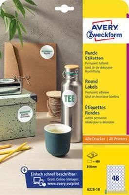 Etykiety o nietypowych kształtach, A4, 10 ark./op., Q30 mm, okrągłe, usuwalne, AVERY ZWECKFORM, 6223REV-10