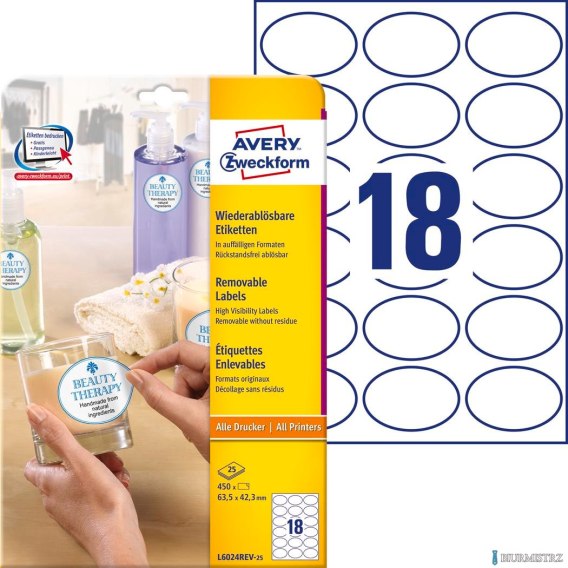 Etykiety owalne L6024REV-25 63,5 x 42,3 25 ark. Białe, usuwalne, Avery Zweckform