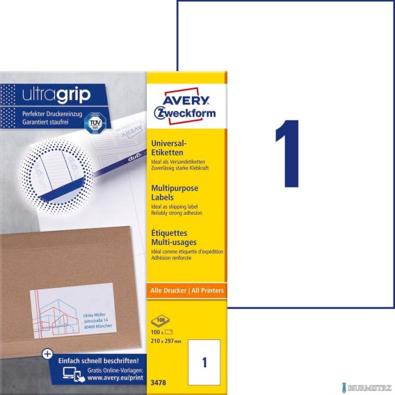 Trwałe Etykiety AVERY ZWECKFORM uniwersalne A4, 100 ark./op., 210 x 297 mm, białe