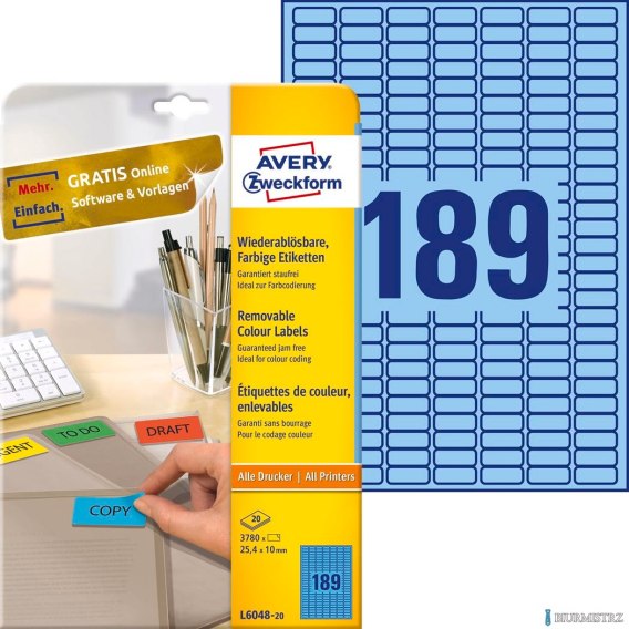 Technologia druku:•INK JET: Tak•LASER: Tak•LASER COLOR: Tak•KSERO: TakCechy produktu:•Rozmiar etykiety (mm): 25,4 x 10•Etykiet / arkusz: 189•Arkuszy/ opakowanie: 20•Etykiet/ opakowanie: 3780•Kolor: niebieskie•Format: A4•Rzędów/ arkusz: 7x27•Certyfikaty: FSC