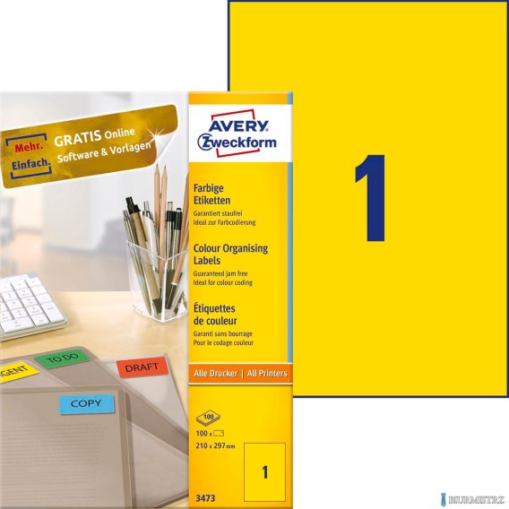 Etykiety AVERY ZWECKFORM trwałe kolorowe A4, 100 ark./op., 210 x 297 mm, żółte