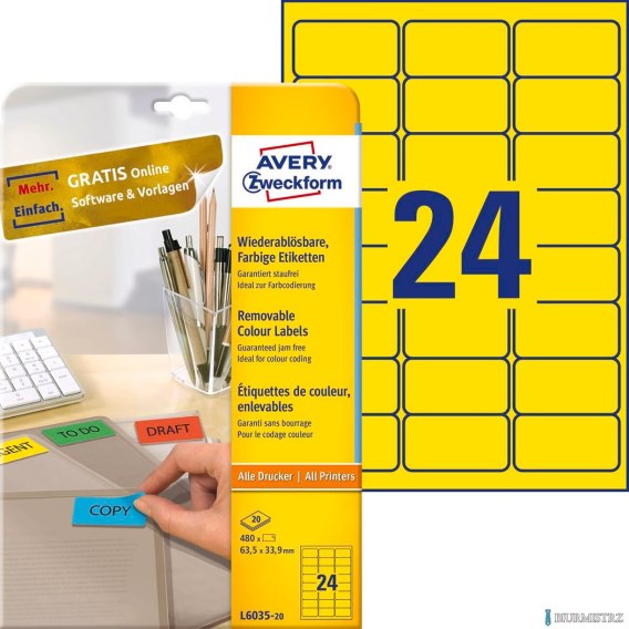 Technologia druku:•INK JET: Tak•LASER: Tak•LASER COLOR: Tak•KSERO: TakCechy produktu:•Rozmiar etykiety (mm): 63,5 x 33,9•Etykiet / arkusz: 24•Arkuszy/ opakowanie: 20•Etykiet/ opakowanie: 480•Kolor: żółte•Format: A4•Rzędów/ arkusz: 3x8•Certyfikaty: FSC