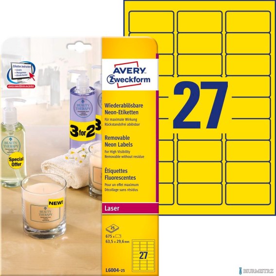 Technologia druku:•LASER: Tak•LASER COLOR: Tak•KSERO: TakCechy produktu:•Rozmiar etykiety (mm): 63,5 x 29,6•Etykiet / arkusz: 27•Arkuszy/ opakowanie: 25•Etykiet/ opakowanie: 675•Kolor: żółte neonowe•Format: A4•Rzędów/ arkusz: 3x9•Certyfikaty: FSC