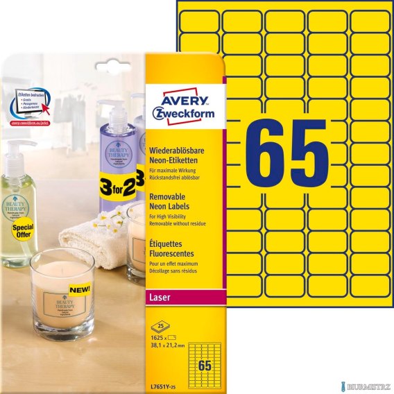 Etykiety AVERY ZWECKFORM neonowe A4, 25 ark./op., 38,1 x 21,2 mm, żółte neonowe