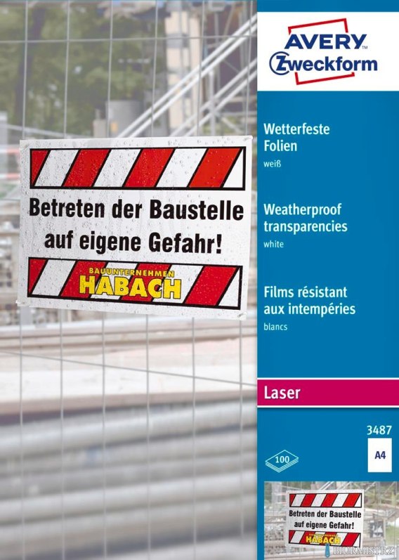 Folie do użytku zewnętrznego 3487 A4 100ark Białe, powlekane, grubość 0,12 mm, Avery Zweckform