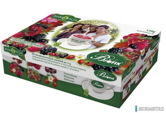 Opis produktu: Kolorowe pudełeczko, w którym znajdziemy aż 6 smakowych kompozycji herbatek Bi fix: malinową, żurawinową, dziką różę, poziomkową, wiśniową i wieloowocową. W szkatułce znajduje się 60 ekspresowych herbatek (po 10 z każdego rodzaju). Każda z nich zamknięta jest w hermetyczną kopertkę, która pozwala na zachowanie niepowtarzalnych aromatycznych i smakowych właściwości naparu. Napoje te są wyjątkowo smaczne, jak również wywierają zbawienny wpływ na nasz organizm.