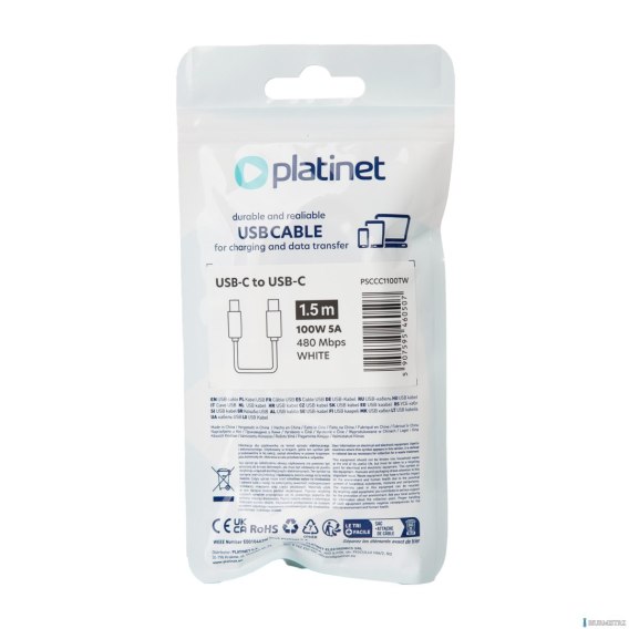 Kabel TYPE USB-C to USB-C, biały, 1.5m, 100W (5A), 480 MBPS TPE, PLATINET PSCCC1100TW