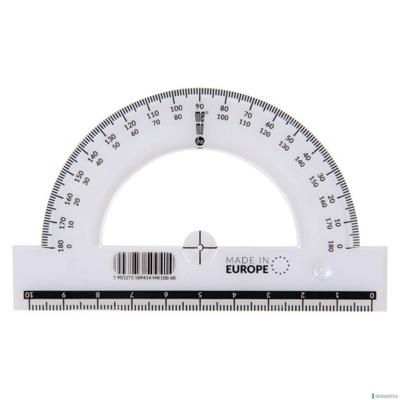 Kątomierz MemoBe by Pratel. Przezroczysty kątomierz 180 stopni. Posiada trwałą nieścieralną podziałkę. Zaokrąglone rogi zapewniają bezpieczeństwo użytkowania. Wykonany precyzyjny nadruk skali (do 0,001 cm). Wykonane z plastiku o odpowiednim stosunku twardości do elastyczności zapewniającym wysoką odporność na złamania. Wyprodukowany zgodnie z europejskimi normami.