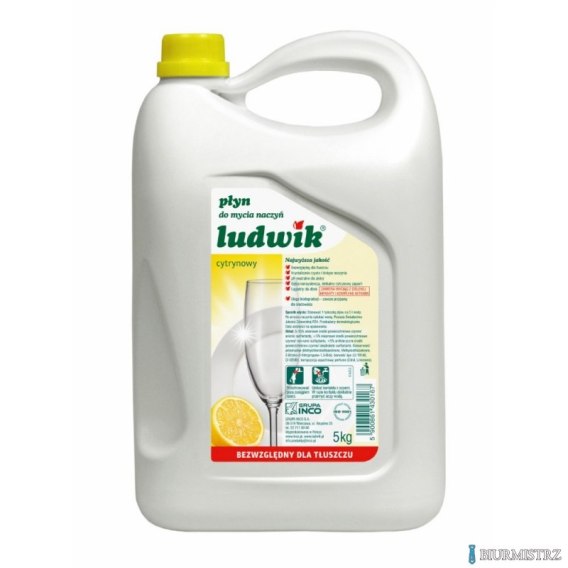 Cytrynowy płyn do mycia naczyń Ludwik_posiada on doskonałe właściwości myjące oraz wysoką zdolność do emulgowania tłuszczów_przy pomocy Ludwika można myć naczynia zarówno w ciepłej, jak i zimnej wodzie_płyn nie pozostawia zacieków na umytych powierzchniach oraz nadaje im połysk bez konieczności wycierania ich do sucha_Ludwik, poza swoim głównym zastosowaniem czyli myciem naczyń, często używany jest do mycia i czyszczenia wszelkiego typu powierzchni sprzętów domowego użytku: mebli, lodówek, wykładzin, podłóg, glazury, dywanów i tworzyw sztucznych_wydajny i bezpieczny dla środowiska płyn do mycia naczyń, który posiada Świadectwo Jakości Zdrowotnej Państwowego Zakładu Higieny_pojemność: 5l_oferta specjalna obowiązuje do wyczerpania zapasów