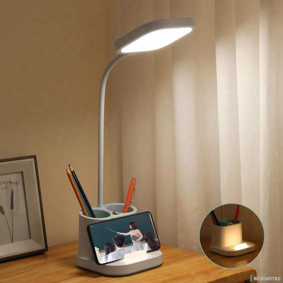 Lampka biurkowa która łączy w sobie funkcje ładowarki do smarfonów, kubka na długopisy i lampki nocnej.