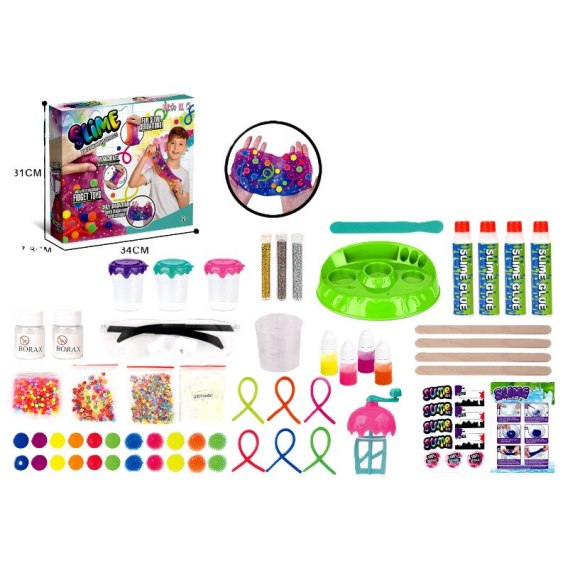 4 × klej slime glue, 2 × boraks (aktywator), 3 × pojemniczki z pokrywkami, 1 × taca do mieszania, 1 × kubek z miarką, 1 × szpatułka, 4 × drewniane mieszadełko, 4 × barwniki (różowy, żółty, pomarańczowy, czerwony), 3 × brokat (złoty, srebrny, czarny), 1 × mikser ręczny, 6 × gumki sensoryczne, fidgety, kulki, koraliki, pył świecący, 1 × okulary ochronne, 2 × arkusze naklejek i instrukcji