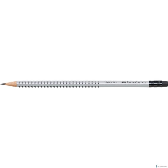 Ołówek grafitowy Grip 2001 Faber-Castell w kolorze srebrnym. Nawet w czasach zdominowanych przez komputery, telefony i internet, ołówek wciąż pozostaje nieodłącznym towarzyszem codzienności. To doskonałe w swojej prostocie narzędzie. Z wbudowaną gumką do wymazywania. Ergonomiczny trójkątny kształt i charakterystyczna dla tej serii opatentowana strefa Grip z małymi, antypoślizgowymi punktami zapewniają wysoki komfort użytkowania i niemęczące, wygodne pisanie i szkicowanie. Odpowiedni również dla leworęcznych. Z odpornym na pękanie grafitem o stopniu twardości B, dzięki bezpiecznemu procesowi wiązania (SV). Wykonany z certyfikowanego drewna pochodzącego ze zrównoważonego i odpowiedzialnie zarządzanego leśnictwa. Powierzchnia pokryta lakierem na bazie wody _ bezpiecznym dla środowiska i zdrowia dzieci. Produkcja neutralna pod względem emisji dwutlenku węgla.