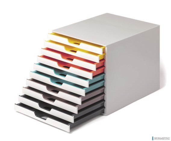 Łatwiejsza organizacja dokumentów: pojemniki z szufladami w nowoczesnym wzornictwie VARICOLOR_. Zamknięte szuflady z delikatnymi kolorowymi liniami na brzegach szuflad pomagają kategoryzować dokumenty, a także wyglądają atrakcyjnie na każdym biurku. _ Pojemnik z 10 kolorowymi szufladami _ Wykonany w wysokiej jakości tworzywa sztucznego _ Cicho i lekko wysuwające się szuflady, posiadające blokady _ Kolorowe szuflady pomagają w organizacji dokumentów _ W zestawie znajdują się przezroczyste okienka z etykietami do drukowania, które też można opisać komputerowo. _ Nadaje się do formatów A4, C4, folio i formatu listowego _ Szuflady można także ustwiać jeden na drugim dzięki antypoślizgowym stopkom z tworzywa. _ Wymiary: 280 x 292 x 356 mm (szer. x wys.x gł.)