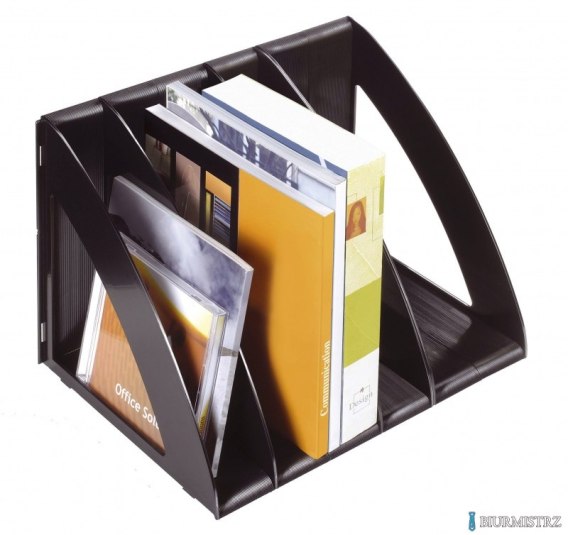 Elegancki pojemnik o uniwersalnym zastosowaniu: może pełnić funkcję sortera, stojaka na czasopisma, etc._wykonany z odpornego na pęknięcia i odkształcenia polistyrenu_z opcją zmiany szerokości przedziałów (regulowany rozstaw separatorów)_dzięki specjalnym zaciskom istnieje możliwość łączenia tyłem lub bocznymi ściankami_zaokrąglone boki zapewniają łatwe wkładanie / wyjmowanie przechowywanych materiałów_sztywne boki zapewniają stabilność stojącym produktom_wymiary: 300x220x220mm_kolor czarny