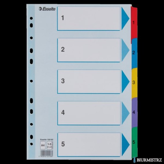 Przekładki kartonowe Mylar A4 Esselte_- do formatu A4_- z grubego, białego kartonu 160 g/m__- numeryczne i alfabetyczne_- specjalne wzmocnienie, kolorowe indeksy_- wzmocniony, perforowany pasek na karcie informacyjno- opisowej_- multiperforacja - pasuje do każdego segregatora_- z kartą informacyjno - opisową_- jednostka sprzedaży 1 komplet