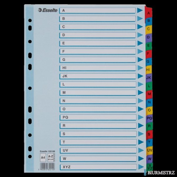 Przekładki kartonowe Mylar A4 Esselte_- do formatu A4_- z grubego, białego kartonu 160 g/m__- numeryczne i alfabetyczne_- specjalne wzmocnienie, kolorowe indeksy_- wzmocniony, perforowany pasek na karcie informacyjno- opisowej_- multiperforacja - pasuje do każdego segregatora_- z kartą informacyjno - opisową_- jednostka sprzedaży 1 komplet