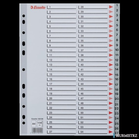 Przekładki A4 plastikowe PP Esselte_- numeryczne lub alfabetyczne_- multiperforowane - pasują do każdego segregatora_- z kartą informacyjno-opisową_- wymiar: 225 x 297 mm_- jednostka sprzedaży 1 komplet
