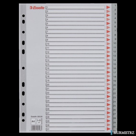 Przekładki A4 plastikowe PP Esselte_- numeryczne lub alfabetyczne_- multiperforowane - pasują do każdego segregatora_- z kartą informacyjno-opisową_- wymiar: 225 x 297 mm_- jednostka sprzedaży 1 komplet