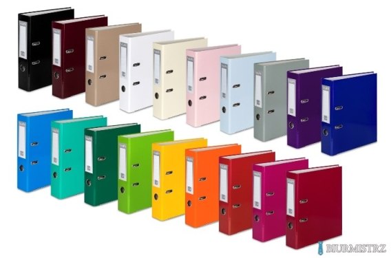 * wykonany z twardej, 2 mm tektury_* oklejka kolorowa, pokryta folią polipropylenową _* wyklejka papierowa_* mechanizm dźwigniowy z dociskiem_* grzbiet o szerokości 50 lub 75 mm_* oczko grzbietowe_* metalowe okucia dolnej krawędzi _* okucia owalne_* wymienna etykieta do opisu