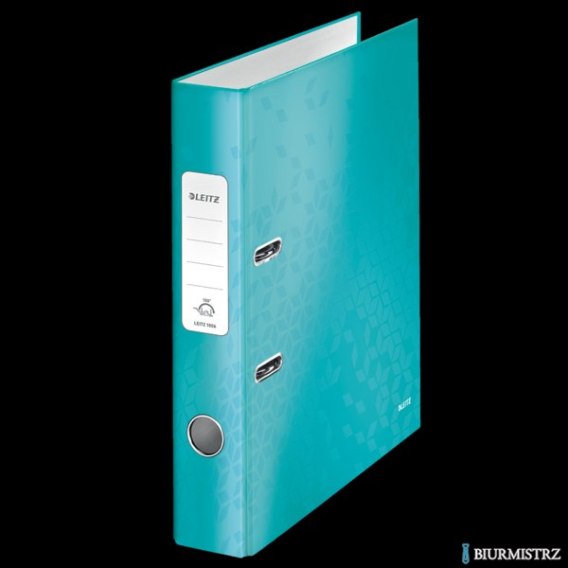 Segregator z mechanizmem WOW Leitz 180___innowacyjny segregator z mechanizmem dźwigniowym 180_ WOW__okładki oklejone kolorowym papierem i zabezpieczone folią nadającą połysk__na grzbiecie samoprzylepna etykieta, którą można łatwo usunąć__dwa okute otwory na okładce z blokadami, na których dopina się okładka__okres gwarancji na mechanizm: 5 lat__jednostka sprzedaży 1 sztuka
