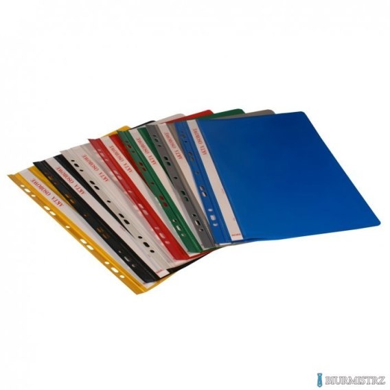 Obie okładki sztywne, nieprzezroczyste z wysokiej jakości kolorowej folii, wyposażony w wysuwany, papierowy pasek do opisu, zaokrąglone rogi obu okładek, posiada boczną perforację, jednostka sprzedaży 1 opakowanie (10 sztuk).