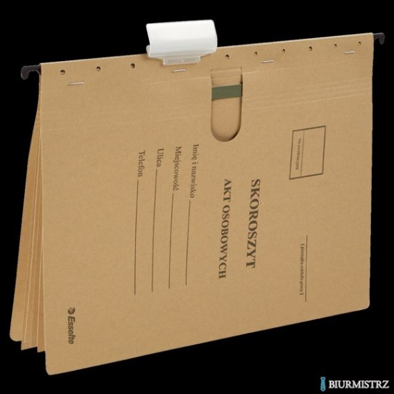 Teczka i skoroszyt zawieszany A4 na akta osobowe Esselte_- do przechowywania akt osobowych z mocnego kartonu 230 g/m__- wewnątrz 3 przegródki, w każdej mechanizm skoroszytowy umożliwiający wpięcie dokumentów (tylko skoroszyt)_- w komplecie identyfikatory i etykiety do opisu zawartości każdej teczki_- certyfikat BLAUE ENGEL dla produktów przyjaznych środowisku_-