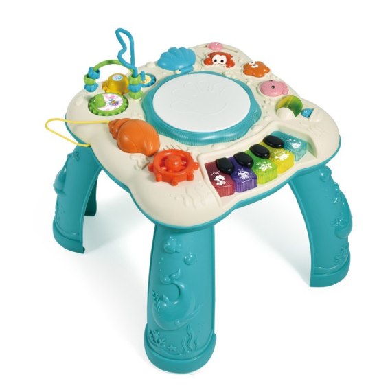 Interaktywny stolik edukacyjny z wbudowanym bębnem świetlnym, Pianinko z kolorowymi klawiszami, Akcesoria do zabawy: kolorowe elementy manipulacyjne (koraliki, obracające się koła zębate), Odczepiane nogi stolika