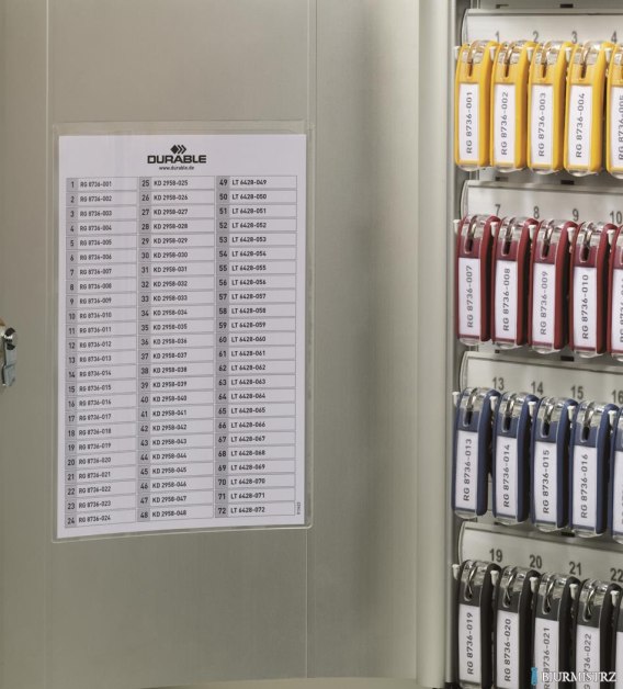 KEY BOX - skrzynki na klucze. Szafka na klucze z zawieszkami Durable_- ponadczasowe wzornictwo_- obudowa wykonana z aluminium_- każda skrzynka zamykana na zamek (w komplecie dwa klucze _ oprócz skrzynki na 12 kluczy zamykanej na rygiel)_- każda skrzynka wyposażona w woreczek z sześcioma zawieszkami na klucze w różnych kolorach, zawieszki te służą jako zapas_- w zestawie znajdują się kołki niezbędne do montażu skrzynki na ścianie_- Wielkości odpowiednio na 12, 18, 36, 54, 48 i 72 klucze._- jednostka sprzedaży 1 sztuka