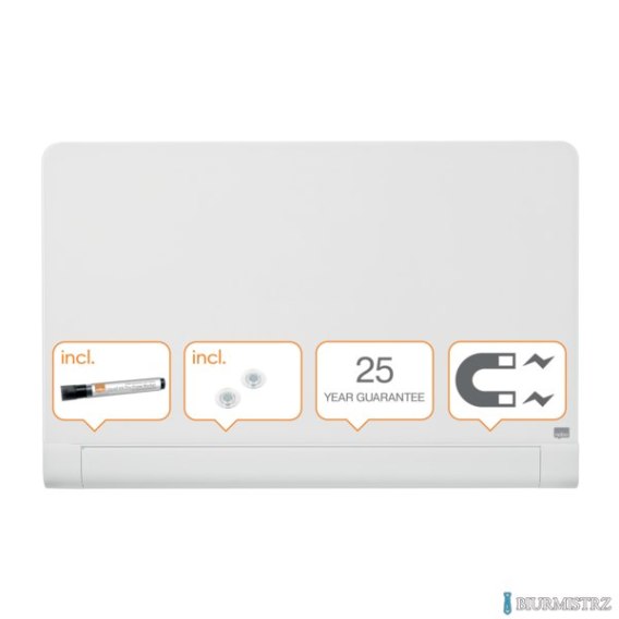 Dzięki panoramicznej szklanej tablicy suchościeralnej Nobo Twoje pomysły zostaną zauważone!_jej panoramiczny format zapewni Ci dużą powierzchnię do pisania_szklana powierzchnia magnetyczna wygląda bardzo elegancko i stylowo_ma zaokrąglone narożniki, długą na całą szerokość tablicy półkę na markery_zapewnia ultrawysoki poziom ścieralności, także przy częstym użytkowaniu_system InvisaMount_ sprawia, że instalacja jest łatwa, a mocowania są starannie ukryte z tyłu tablicy_rozmiar: 45__wymiary: 100x60cm_gwarancja: 25 lat_kolor: biały
