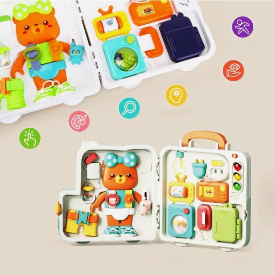 Edukacyjna tablica manipulacyjna w formie walizki to wielofunkcyjna zabawka, która wspiera rozwój dziecka poprzez aktywną zabawę. Inspirowana metodą Montessori, zawiera liczne elementy znane z codziennego życia, odwzorowane w bezpieczny i angażujący sposób. Dzięki kompaktowej formie walizki, zabawkę można łatwo zabrać w podróż lub schować po zakończeniu zabawy.