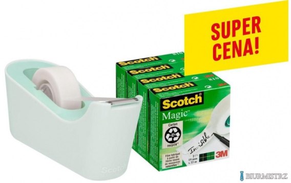 Scotch_ Magic_ to jedna z najpopularniejszych taśm na świecie - do domu, biura i szkoły_idealna do naprawiania i sklejania dokumentów, zaklejania kopert oraz przyklejania zdjęć i grafik_matowa na rolce, niewidoczna po naklejeniu na papier, także na fotokopiach, skanach i zdjęciach_zestaw promocyjny to więcej Twojej ulubionej taśmy z podajnikiem w SUPER CENIE_taśma z podajnikiem to idealny zestaw dla każdego, kto często korzysta z taśmy_dzięki podajnikowi z obciążoną podstawą i metalową gilotyną, taśmę odetniesz jedną ręką_do podajnika pasują wszystkie taśmy Scotch_ o szerokości do 19mm i długości do 33m_grubość taśmy: 56 mikronów_klej syntetyczny akrylowy odporny na żółknięcie i wysychanie, Adhezja do stali 15 N/cm_opakowanie zawiera 4 rolki taśmy klejącej Scotch_ Magic_ w rozmiarze 19mm x 33m i odajnik C-18_kolor taśmy: transparentny_kolor podajnika: miętowy