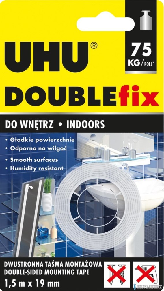 Dwustronna taśma montażowa UHU Doublefix 1,5 m x 19 mm. Do trwałego mocowania i łączenia przedmiotów w pomieszczeniach. Prosta, szybka i czysta alternatywa dla śrub i gwoździ. Zapewnia trwałe i bezpieczne trzymanie prawie wszystkich gładkich powierzchni, np. metal, płytki, plastik, szkło i malowane drewno. Idealna do montażu luster, uchwytów, znaków, haczyków, elementów regałów, kanałów kablowych, przedmiotów dekoracyjnych, profili dekoracyjnych i wielu innych. Pełne obciążenie po 60 minutach. Odporna na wilgoć i temperaturę od-10_C do +75_C. Nadaje się do gładkich i równych powierzchniach. Nieodpowiednia do zastosowanie na zewnątrz i na szorstkich powierzchniach. Klejone powierzchnie muszą być twarde, czyste, suche, odtłuszczone i bez kurzu. Wystarczy przykleić taśmę do przedmiotu, tak by nie powstały pęcherzyki powietrza, następnie usunąć folię ochronną bez dotykania kleju i przymocować przedmiot do wybranego miejsca. Ważne by mocno docisnąć klejone części. Siła przyczepności zależy od jakości powierzchni, jak również jakości i grubości mocowanego przedmiotu.