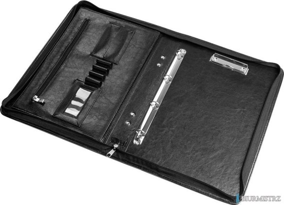 - teczka wykonana z wysokiej jakości ekoskóry_- zamykana na suwak_- grzbiet 50 mm_- wyposażona w kieszeń przestrzenną, kieszeń zamykaną na suwak, 2 kieszonki na wizytówki, kieszeń z okienkiem na wizytowniki, miejsce na długopis, ring 4R do wpinania, klip do utrzymywania notesu lub notatek