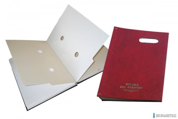 Teczka do podpisu z okienkiem Warta_- okładka twarda oklejana. Grzbiet harmonijka. Łączenie okładki z blokiem wzmocnione nitami. Na przedniej okładce okienko z szybką, pod którą można umieszczać napisy. _- blok z kartonu barwionego w masie zawiera 20 kart z 2 otworami i wyciętymi registrami_- jednostka sprzedaży 1 sztuka