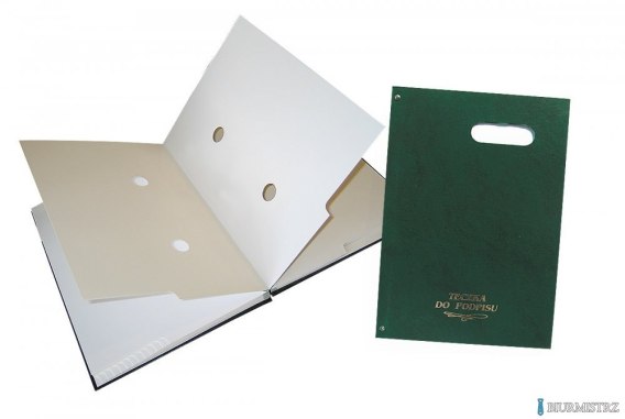 Teczka do podpisu z okienkiem Warta_- okładka twarda oklejana. Grzbiet harmonijka. Łączenie okładki z blokiem wzmocnione nitami. Na przedniej okładce okienko z szybką, pod którą można umieszczać napisy. _- blok z kartonu barwionego w masie zawiera 20 kart z 2 otworami i wyciętymi registrami_- jednostka sprzedaży 1 sztuka