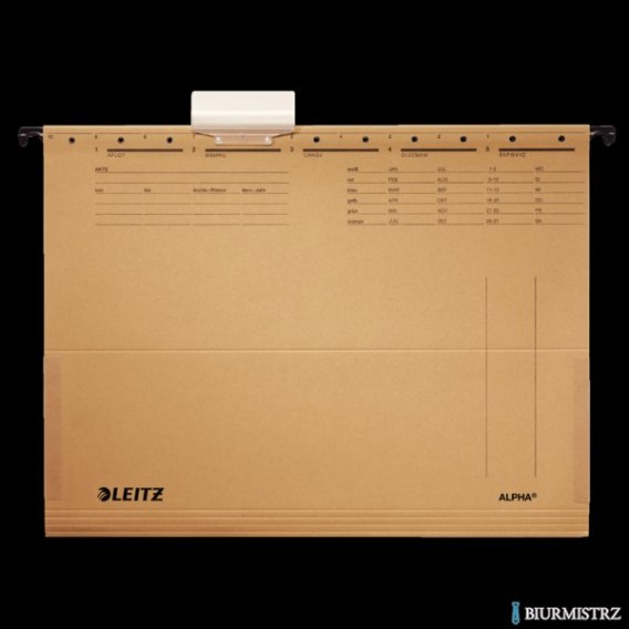 Teczka zawieszana Alpha Leitz_- do przechowywania luźnych kartek_- wycięcia na przedniej i tylnej okładce służące do mocowania mechanizmu skoroszytowego_- karton uzyskany w 100% w recyklingu, gramatura 250 gsm_- certyfikat BLAUE ENGEL dla produktów przyjaznych środowisku_- jednostka sprzedaży 1 opakowanie (25 sztuk)