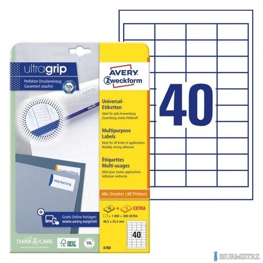 Technologia druku:•INK JET: Tak•LASER: Tak•LASER COLOR: Tak•KSERO: TakCechy produktu:•Rozmiar etykiety (mm): 48,5 x 25,4•Etykiet / arkusz: 40•Arkuszy/ opakowanie: 30•Etykiet/ opakowanie: 1200•Kolor: białe•Format: A4•Rzędów/ arkusz: 4x10•Certyfikaty: FSC