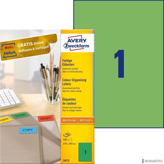 Etykiety AVERY ZWECKFORM trwałe kolorowe A4, 100 ark./op., 210 x 297 mm, zielone