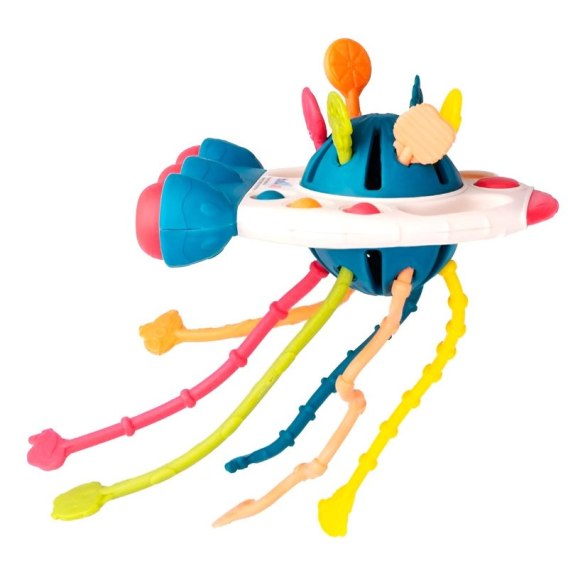 Kosmiczna zabawka wyposażona w wiele ruchomych elementów, takich jak kolorowe kropeczki do wciskania i linki do przeciągania. Wykonując te precyzyjne czynności, dziecko gimnastykuje paluszki, ćwicząc tym samym motorykę małą. Elastyczne linki zdobią zróżnicowane wypustki i symbole owoców oraz pojazdów. Praktyczne otwory umieszczone w rakiecie ułatwią maluchom chwytanie i przenoszenie zabawki.