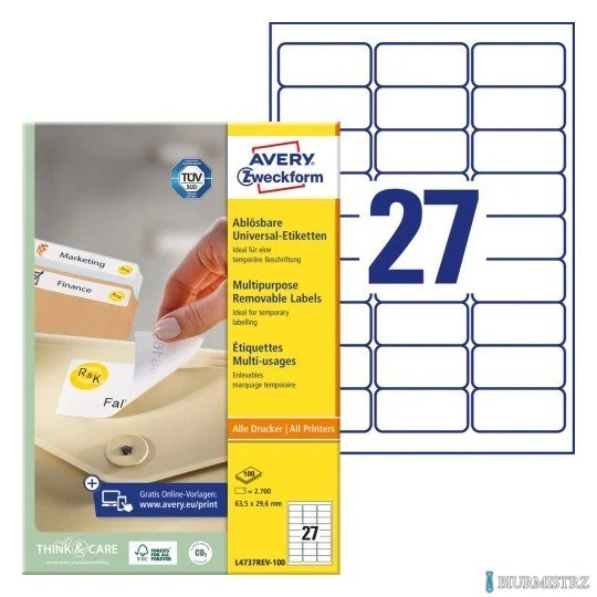 Usuwalne etykiety uniwersalne, A4, 100 ark./op., 63,5 x 29,6 mm, białe, AVERY ZWECKFORM, L4737REV-100