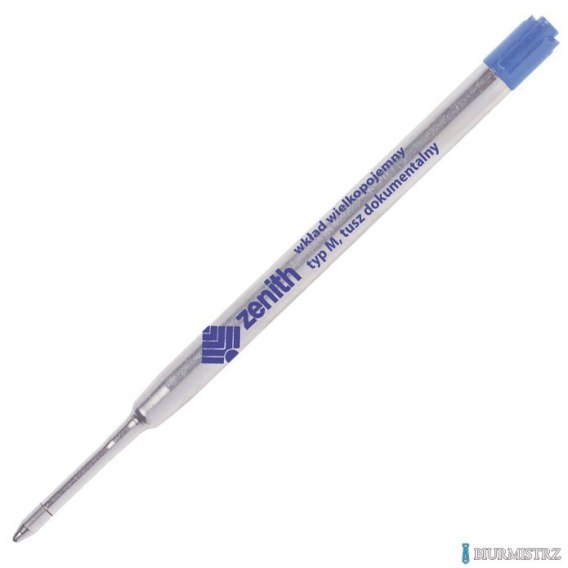 Wkład Zenith - 4 (20)_Metalowy wkład wielkopojemny, dostępny w trzech kolorach tuszu: niebieskim, czarnym, czerwonym. Jest to tusz dokumentalny, odporny na działanie światła i wody. Średnica kulki wkładu wynosi: 0,8 mm, szerokość linii pisania: 0,5 _ 0,7 mm, długość linii pisania: 3_500 m. Końcówka wkładu wykonana jest z mosiądzu wysokoniklowego, tzw. nowe srebro, i wyposażona w kulkę z węglika wolframu TC, co podnosi żywotność końcówki, dając równomierność parametrów pisania w trakcie całego okresu eksploatacji. Jednostka sprzedazy 1 opakowanie